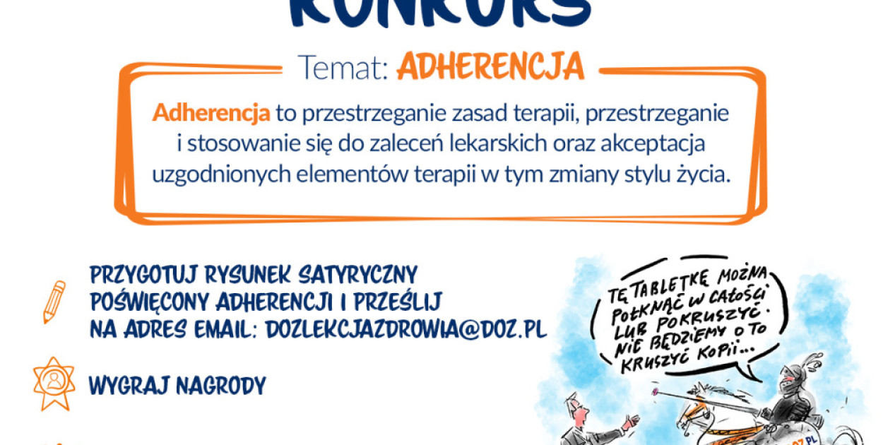 I właśnie z tej potrzeby zrodziła się kolejna inicjatywa kampanii DOZkonała Lekcja Zdrowia. Rusza konkurs na rysunek satyryczny o adherencji, skierowany do wszystkich osób w Polsce. Jego celem jest pokazanie w prosty, błyskotliwy i przystępny sposób, czym naprawdę jest przestrzeganie zaleceń terapeutycznych i dlaczego ma ono tak duże znaczenie dla zdrowia.
